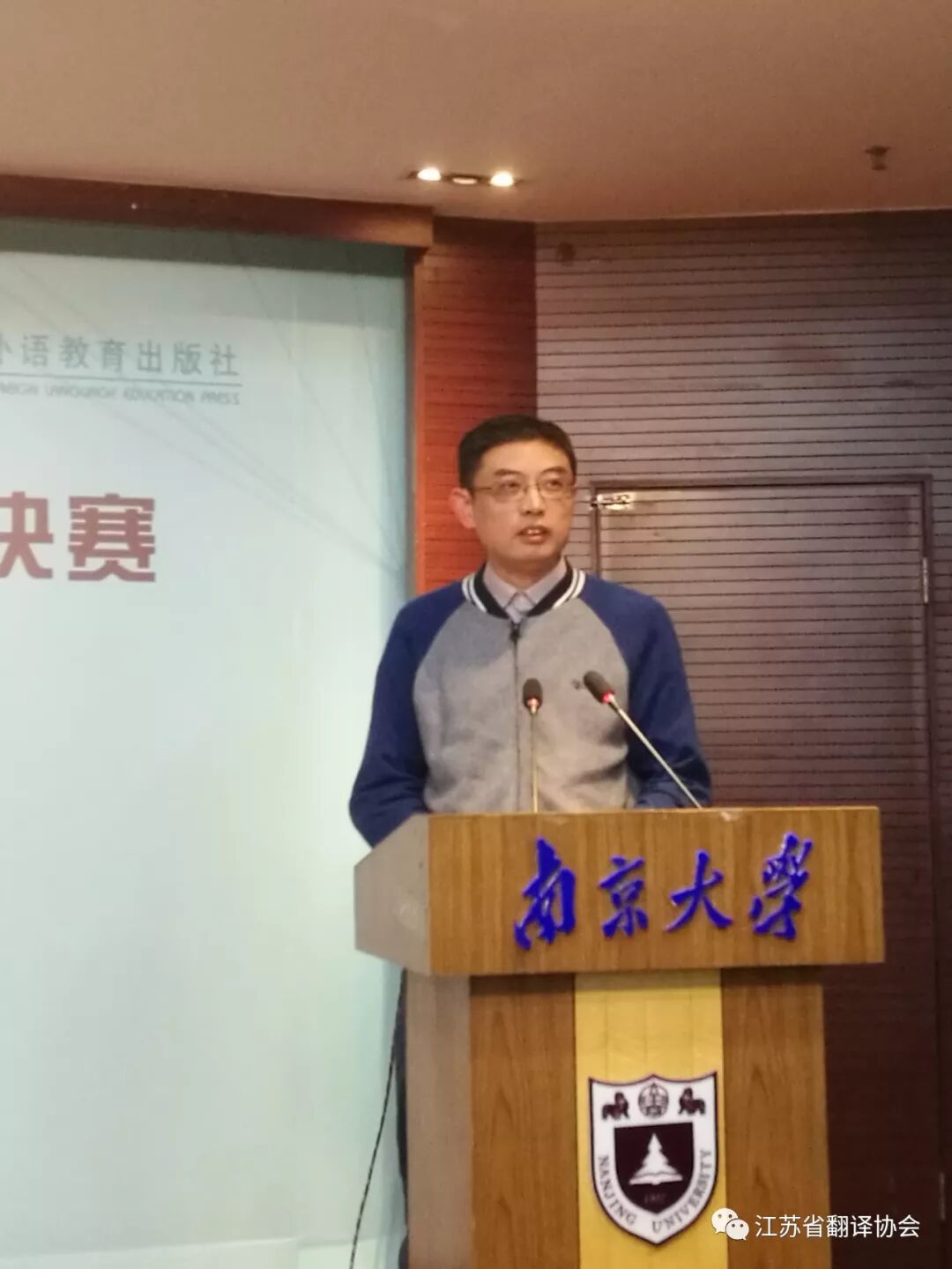 10月31日,34名晉級選手在南京大學海外教育學院分別參加了本科英語組、高職英語組、日語組和留學生組四個組別的現(xiàn)場決賽。江蘇省教育廳高教處徐慶副處長、江蘇省高等學校外國語教學研究會李霄翔會長、江蘇省翻譯協(xié)會秘書長吳文智教授、江蘇省外國語言學會會長辛斌教授、南京大學海外教育學院院長趙文書教授、大賽評審組長南京大學王海嘯教授、上海外國語大學譚晶華教授、上海外語教育出版社江蘇地區(qū)經(jīng)理黃新炎副編審等出席頒獎典禮并頒獎。王海嘯教授和譚晶華教授從語言能力,現(xiàn)場表現(xiàn)和邏輯能力等幾個方面對本次大賽做了精彩點評。頒獎典禮由南京大學海外教育學院院長趙文書教授主持。